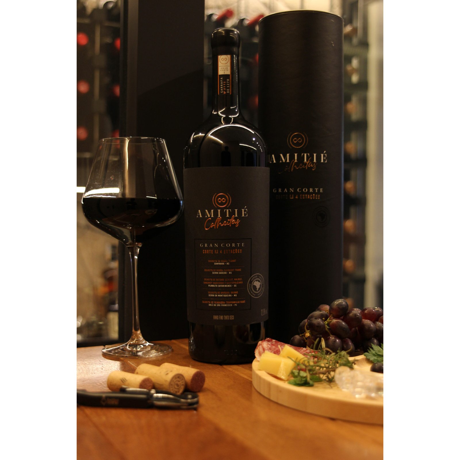Blend das cinco variedades da linha Colheitas: Cabernet Franc, Tannat, Tempranillo Rosé, Shiraz, além de um blend composto por Merlot, Malbec, Cabernet Sauvignon e Montepulciano